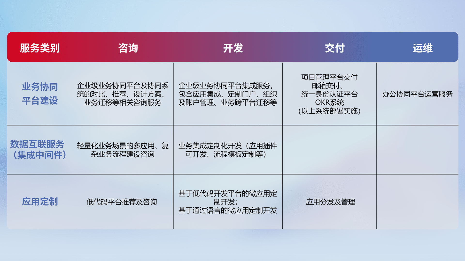 针对钉钉、、企微、、、IDaas等平台级产品提供产品的规划、、方案、、、交付、、、定制化开发等服务,,实现如统一协同办公、、、、智能客户服务、、混合会议管理、、智能数据查询、、、、等业务场景,,,,实现数字化转型。。。
